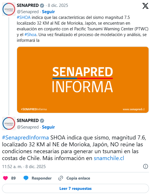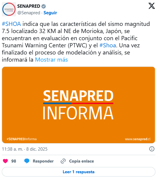 El Servicio Hidrográfico y Oceanográfico de la Armada (SHOA) descartó riesgo de tsunami para las costas de Chile tras un terremoto 7.6 registrado en las costas de Aomori, Japón.